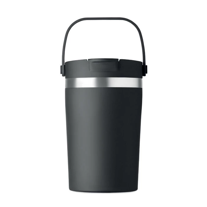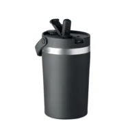 Dwuścienny kubek ze stali nierdzewnej (90% stal nierdzewna z recyklingu i 10% stal nierdzewna) z pokrywką z PP 2 w 1 i słomką oraz paskiem z RPET. Nie przecieka i jest wytrzymały. Pojemność: 350 ml.