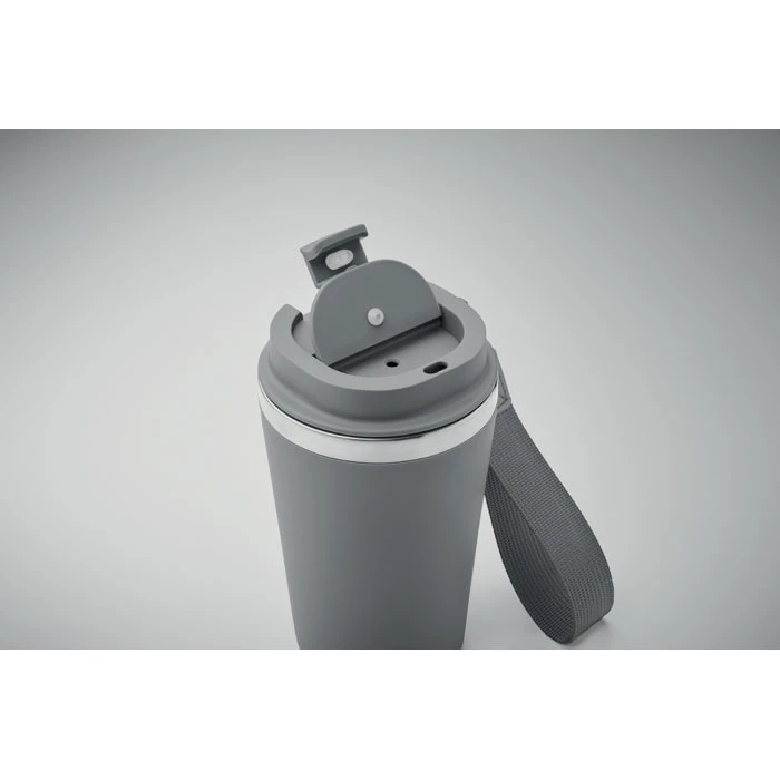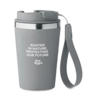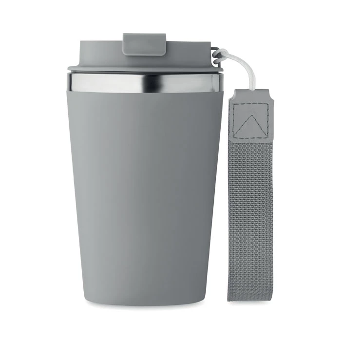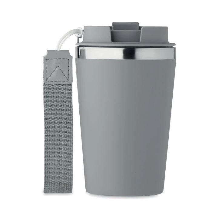 Kubek z podwójnymi ściankami z recyklingowanej stali nierdzewnej (90% recyklingowanej stali nierdzewnej i 10% stali nierdzewnej) z zewnętrzną warstwą z PP i paskiem na nadgarstek z RPET. Pojemność: 350 ml.