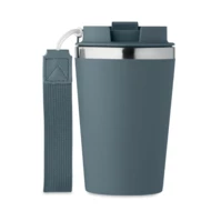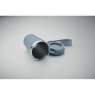 Kubek z podwójnymi ściankami z recyklingowanej stali nierdzewnej (90% recyklingowanej stali nierdzewnej i 10% stali nierdzewnej) z zewnętrzną warstwą z PP i paskiem na nadgarstek z RPET. Pojemność: 350 ml.