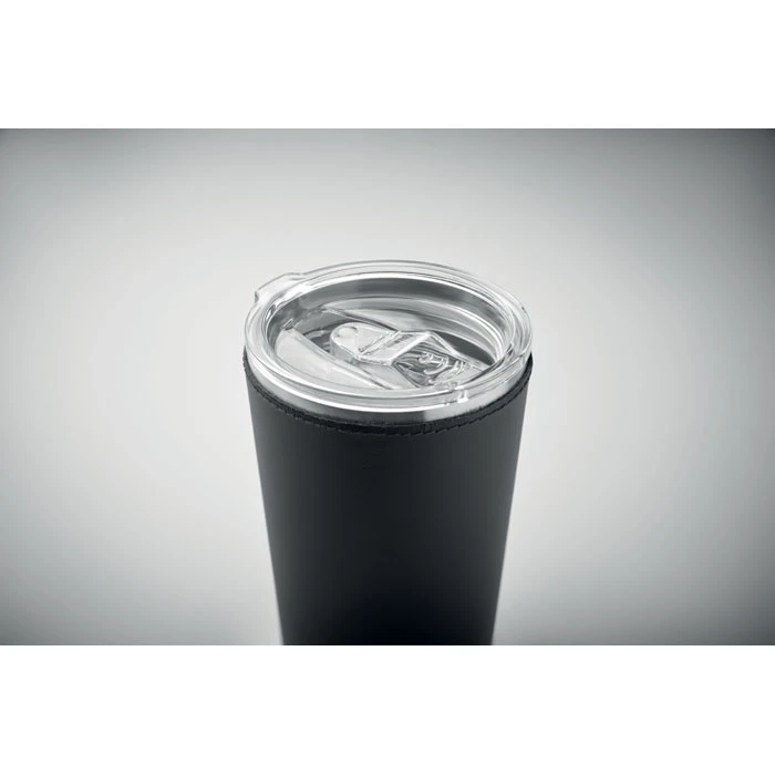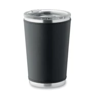 Kubek o podwójnych ściankach wykonany ze stali nierdzewnej pochodzącej z recyklingu (90% stali nierdzewnej pochodzącej z recyklingu i 10% stali nierdzewnej) ze zdejmowanym pokrowcem ze skóry PU. Pokrywka z zasuwanym otworem do picia. Nie przecieka. Pojemność: 350 ml.