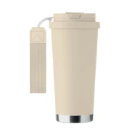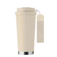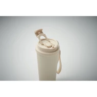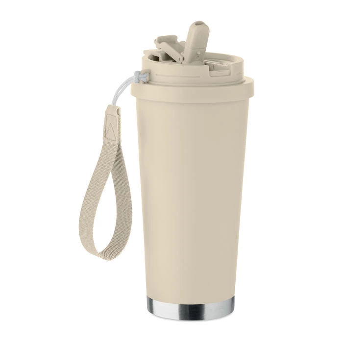 Kubek z podwójnymi ściankami z recyklingowanej stali nierdzewnej z pokrywką z PP (2 w 1: otwór do picia i pokrywka ze słomką) i paskiem do przenoszenia z RPET. Nie przecieka. Pojemność: 500 ml.
