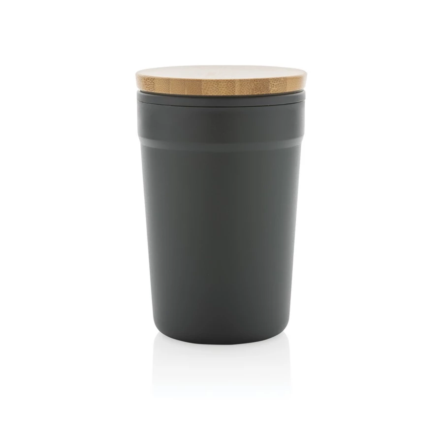 Kubek podróżny 300 ml, bambusowe wieczko, wykonany z PP z recyklingu z certyfikatem GRS, całkowita zawartość materiałów z recyklingu obliczona na podstawie wagi całkowitej przedmiotu: 52%, w ozdobnym pudełku z papieru kraftowego z certyfikatem FSC®, ślad węglowy produktu: 0,39 kg CO2
