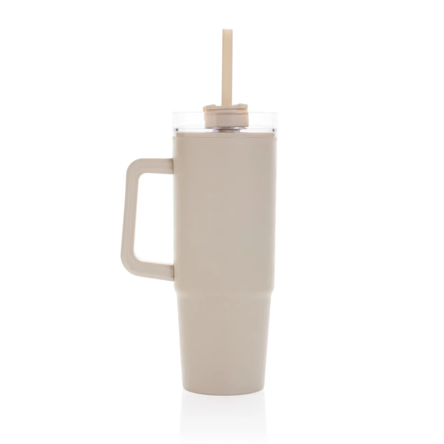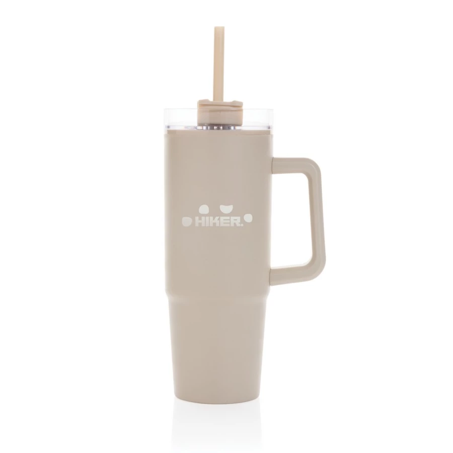 Kubek podróżny 900 ml, ergonomiczny uchwyt, obrotowe wieczko trzema pozycjami (dziubek do picia, otwór na słomkę, zamknięte), wykonany z materiałów z recyklingu, całkowita zawartość materiałów obliczona na podstawie wagi całkowitej przedmiotu: 80%, wyłącznie mycie ręczne, w pudełku z papieru kraftowego