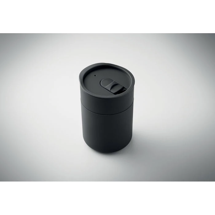Kubek z PP z silikonową osłoną i przesuwaną pokrywką z PP. Pojemność: 330 ml. Ponieważ jest to kubek jednościenny, nadal może dochodzić do wymiany ciepła.