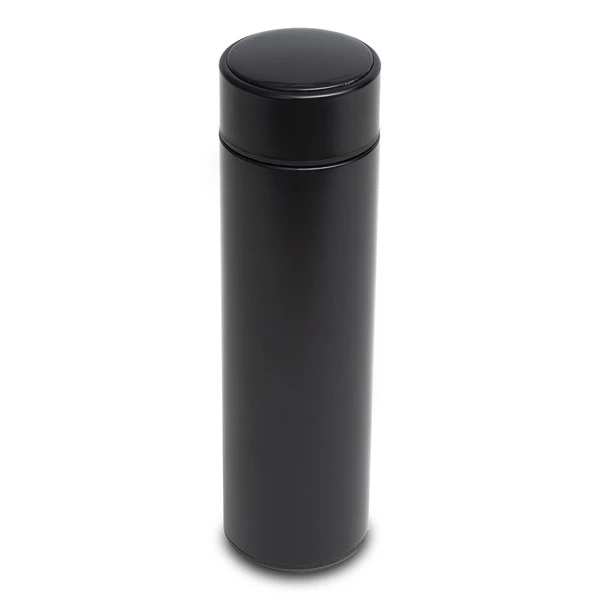 Termos próżniowy o pojemności 420 ml z dwiema metalowymi ściankami, świetnie utrzymujący ciepło, szczelny. Wnętrze wykonane ze stali nierdzewnej 18/8 o podwyższonej jakości. Posiada wbudowany w nakrętkę termometr z wymienna baterią CR2032, który przy dotknięciu wyświetlacza pokazuje temperaturę napoju . W zestawie stalowe siteczko do zaparzania herbaty. Utrzymuje temperaturę powyżej 40°C do 15 godzin.