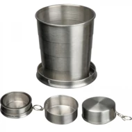 Składany kubek do picia ze stali nierdzewnej o pojemności 250 ml. Można go przechowywać w zintegrowanej metalowej puszce z karabińczykiem, aby zaoszczędzić miejsce.