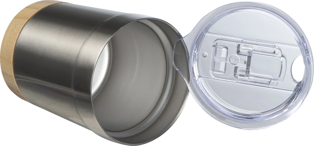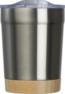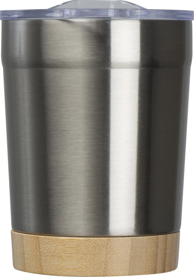 Kubek wykonany ze stali nierdzewnej, pochodzącej z recyklingu, z bambusowym dnem, o pojemności 300 ml.