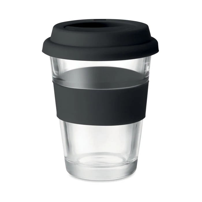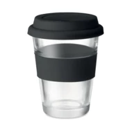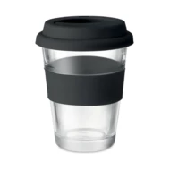Szklany kubek z silikonową pokrywką i uchwytem. Pojemność 350 ml. Kubek posiada pojedynczą ściankę, więc może się nagrzewać.