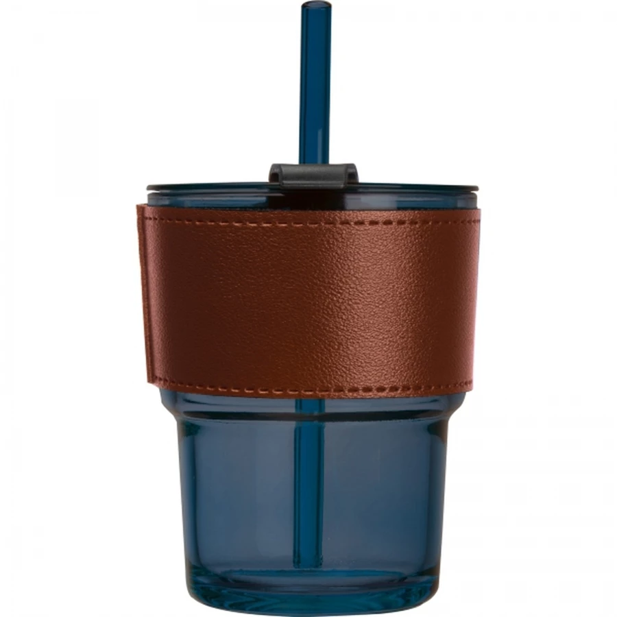 Kubek wykonany z kolorowego szkła z dopasowaną kolorystycznie słomką oraz rękawem z PU. Ustnik do picia zamykany na zatrzask oraz dziurka na słomkę zamykana za pomocą silikonowego elementu.