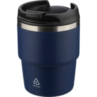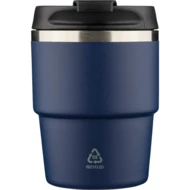 Kubek termiczny 175 ml, posiada podwójne ścianki ze stali nierdzewnej z próżnią między ściankami, co spowalnia oddawanie temperatury na zewnątrz, zachowując funkcje termosu, ikona recyklingu na produkcie, zapakowany pojedynczo w brązowe kartonowe pudełko, produkt wykonany z recyklingowej stali nierdzewnej (wewnątrz 304 / na zewnątrz 201) z pokrywką z PP, utrzymuje temperaturę napojów gorących do 4 godzin