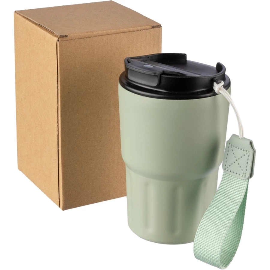 Kubek termiczny 320 ml, posiada podwójne ścianki ze stali nierdzewnej z próżnią między ściankami, co spowalnia oddawanie temperatury na zewnątrz, zachowując funkcje termosu, pasek ułatwiający noszenie lub przypięcie, plastikowe wieczko z otwarciem umożliwiającym łatwą obsługę jedną ręką, dobrze trzyma temperaturę ciepłych i zimnych napojów, utrzymuje temperaturę napojów gorących do 10 godzin +leakproof