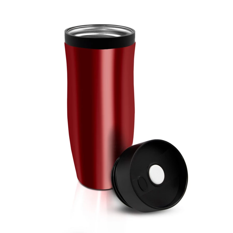 Kubek termiczny 375 ml Air Gifts, posiada podwójne ścianki ze stali nierdzewnej z miedzianą izolacją próżniową, co spowalnia oddawanie temperatury na zewnątrz, zachowując funkcje termosu, plastikowe wieczko z przyciskiem otwarcia/zamknięcia ustnika umożliwiającym obsługę jedną ręką, błyszczące wykończenie, utrzymuje temperaturę napojów gorących do 20 godzin +leakproof
