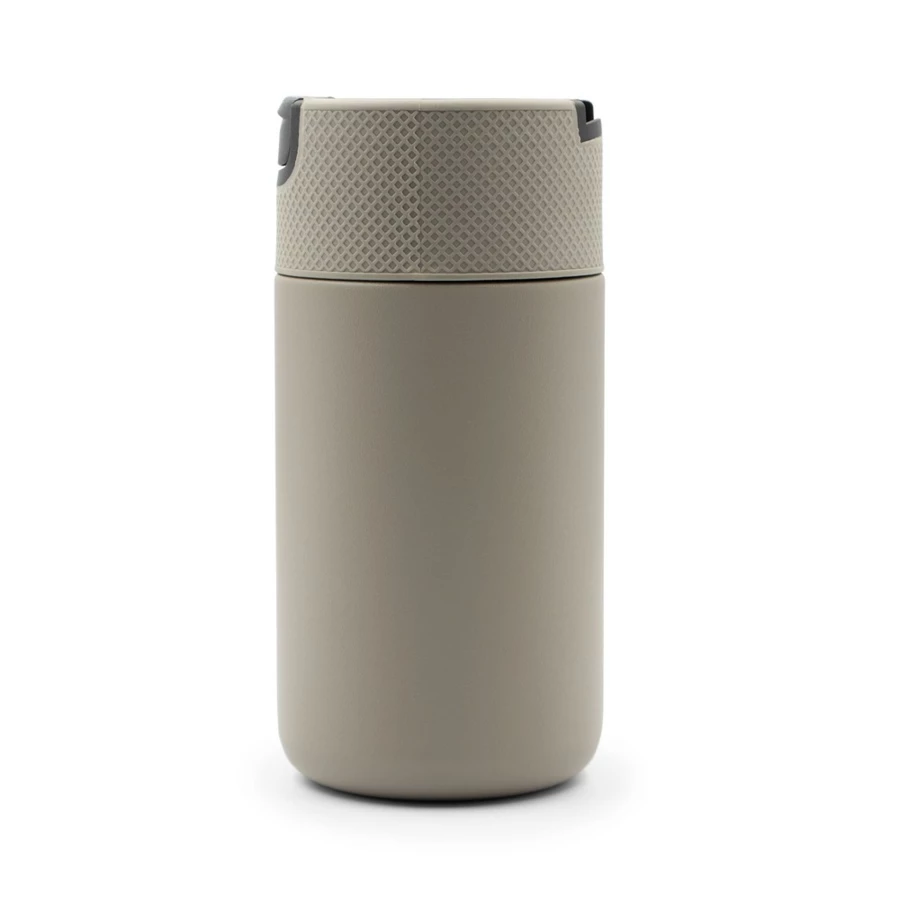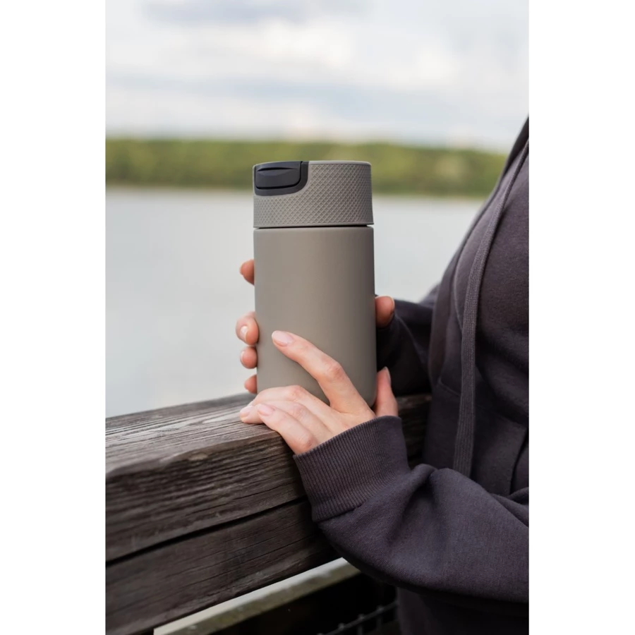 Kubek termiczny 400 ml Air Gifts, posiada podwójne ścianki ze stali nierdzewnej z próżnią między ściankami, co spowalnia oddawanie temperatury na zewnątrz, zachowując funkcje termosu, plastikowe wieczko z zamknięciem umożliwiającym obsługę jedną ręką, matowe wykończenie, utrzymuje temperaturę napojów gorących do 10 godzin +leakproof