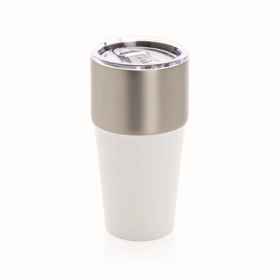 Kubek termiczny 500 ml, wykonany z materiałów z recyklingu z certyfikatem RCS, podwójne ścianki z próżnią pomiędzy, utrzymuje temperaturę napojów ciepłych do 5 godzin i zimnych do 15 godzin, wyłącznie mycie ręczne, całkowita zawartość materiałów z recyklingu obliczona na podstawie wagi całkowitej produktu: 81%