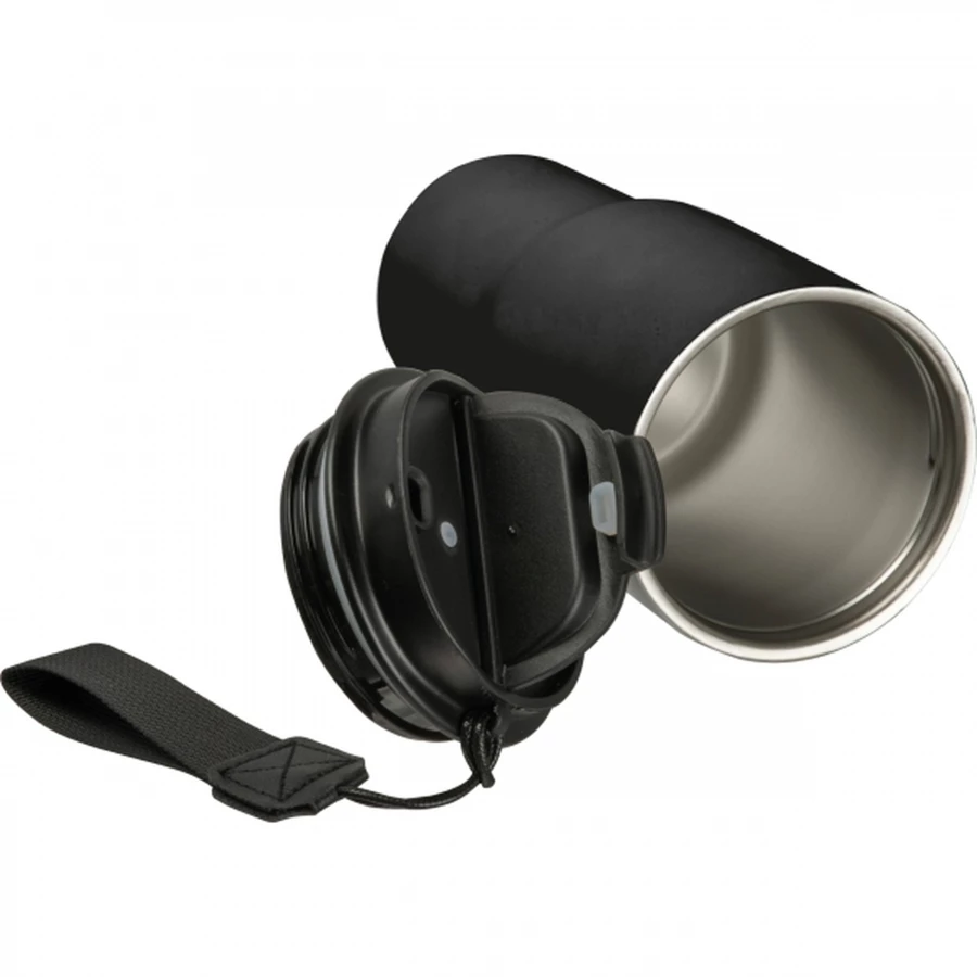 Kubek termiczny, wykonany ze stali nierdzewnej z recyklingu, z podwójnymi ściankami, o pojemności 550 ml. Kubek posiada praktyczny pasek do przenoszenia.
