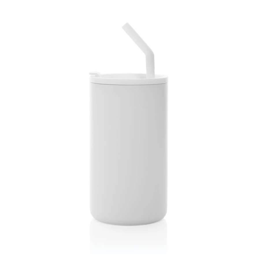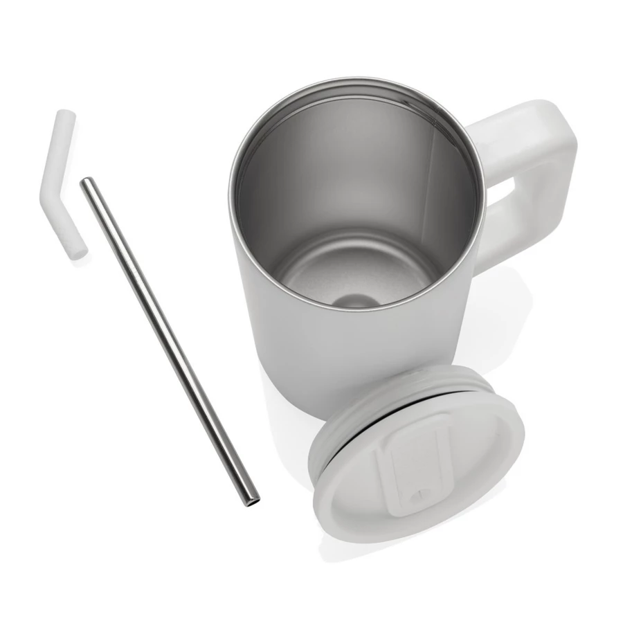 Kubek termiczny 800 ml, posiada słomkę z silikonową nakładką, zakręcane wieczko, wykonany ze stali nierdzewnej z recyklingu, podwójne ścianki ze stali nierdzewnej z próżnią między ściankami, dzięki czemu zachowuje funkcje termosu i długo utrzymuje temperaturę nie oddając jej na zewnątrz, zalecane mycie ręczne