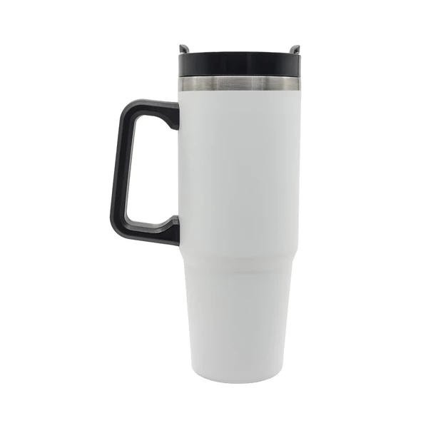Kubek próżniowy z dwiema ściankami ze stali nierdzewnej. Wieczko z zamykanym otworem do picia i słomką. Posiada rączkę do wygodnego trzymania kubka. Sprawdzi się w podróży, pracy, czy na spacerach, zapewniając nawodnienie na długi czas dzięki dużej pojemności. Utrzymuje temperaturę powyżej 40°C przez 6 godzin.