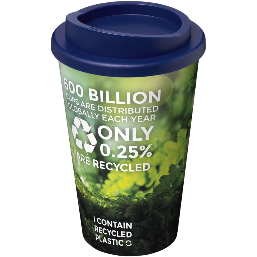 Dwuwarstwowy, izolowany kubek z zakręcaną pokrywą odporną na zalanie. Zewnętrzna warstwa kubka wykonana jest z tworzywa sztucznego pochodzącego z recyklingu. Kubek charakteryzuje się pełnokolorowym, zawijanym wzorem dopasowanym do produktu, dzięki czemu jest trwały. Zgodny z EN12875-1; nadaje się do mycia w zmywarce oraz podgrzewania w kuchence mikrofalowej. Pojemność wynosi 350 ml. Mieszaj i łącz kolory, aby stworzyć idealny kubek. Wykonano w Wielkiej Brytanii. Produkt wolny od BPA. Można myć w zmywarce.