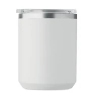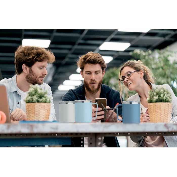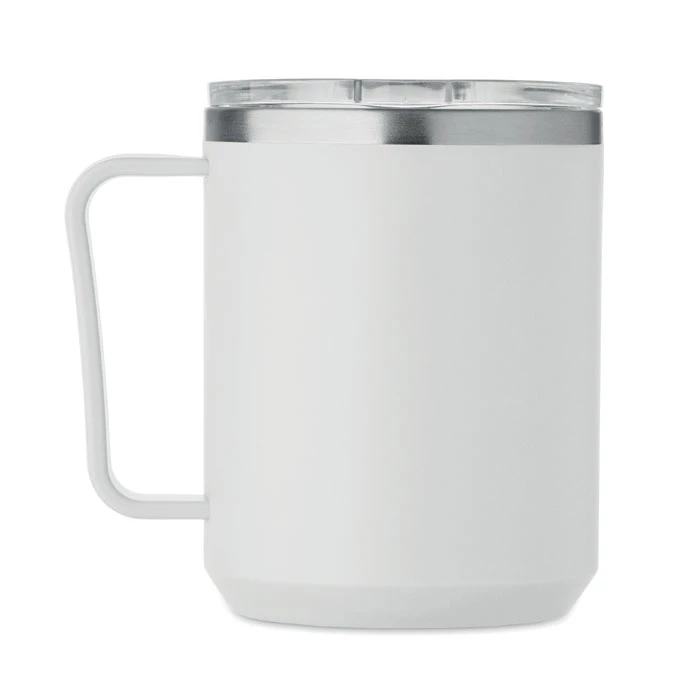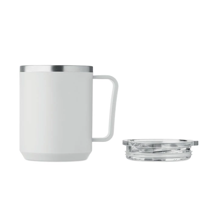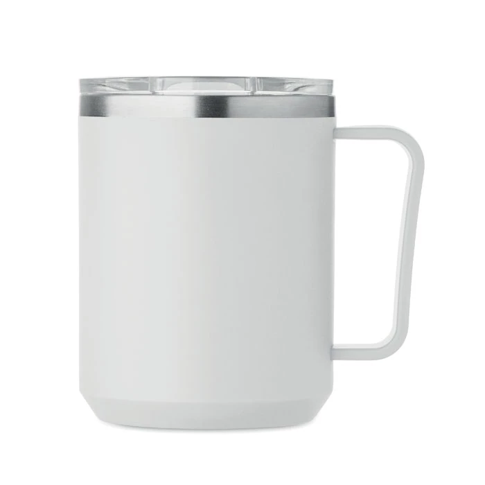 Kubek o podwójnych ściankach. Wnętrze 90% stal nierdzewna z recyklingu i 10% stal nierdzewna oraz zewnętrzna ścianka z PP z recyklingu. Ma przezroczystą pokrywkę przesuwną AS. Pojemność 400 ml.