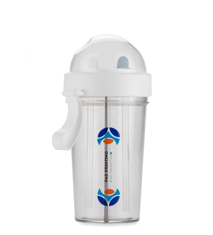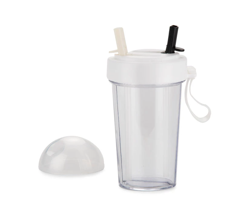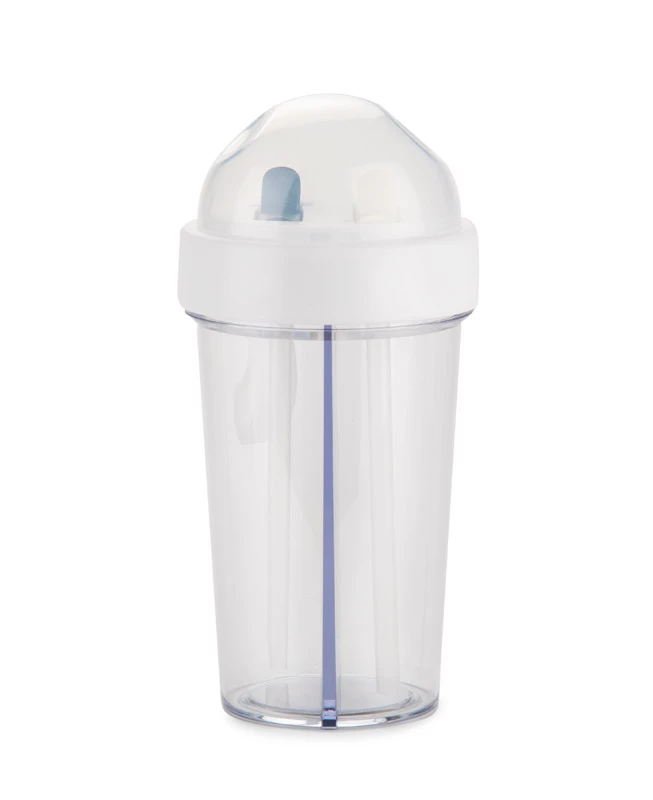 DUI 420 ml to praktyczny pojemnik z dwiema niezależnymi komorami, umożliwiający przechowywanie dwóch różnych napojów jednocześnie. Wbudowane słomki ze składanymi ustnikami (biały i czarny) pozwalają na wygodne picie bez mieszania płynów. Zakręcana obręcz z silikonowym uchwytem zapewnia pewny chwyt, a pokrywka umożliwia zamknięcie bidonu, gdy słomki są złożone.