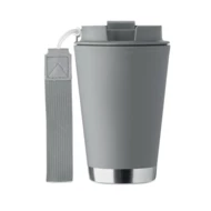 Dwuścienny kubek z wewnętrzną ścianką z PP, zewnętrzną ścianką z PP pochodzącego z recyklingu, detalami ze stali nierdzewnej pochodzącej z recyklingu i paskiem na nadgarstek z RPET. Pojemność: 300 ml.
