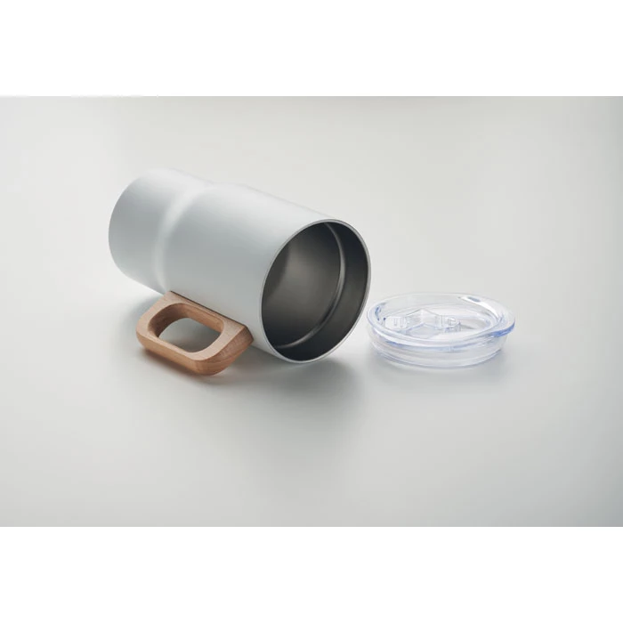 Kubek z podwójnymi ściankami z recyklingowanej stali nierdzewnej (90% stali nierdzewnej z recyklingu i 10% stali nierdzewnej) z drewnianym uchwytem. Pojemność: 350 ml.