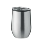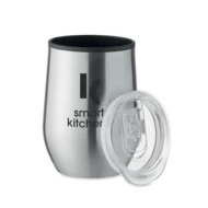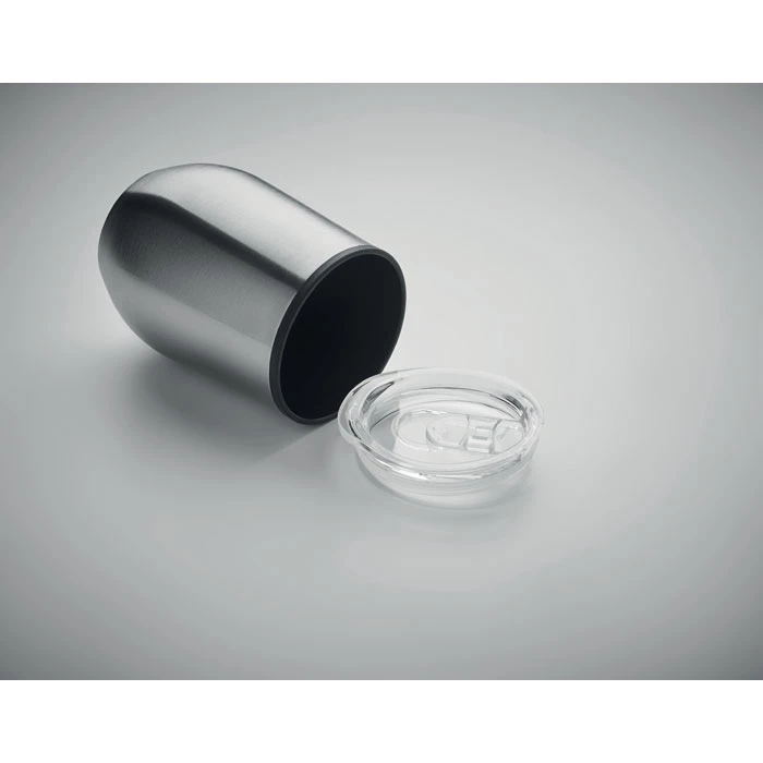 Dwuścienny kubek ze stali nierdzewnej z wewnętrznym PP i przezroczystą pokrywką z PS. Pojemność: 350 ml.