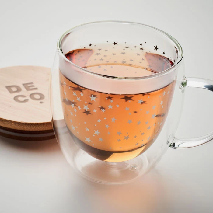 Szklany kubek borokrzemianowy o podwójnych ściankach, z motywem gwiazdek i bambusową pokrywką. Pojemność: 220 ml. Bambus jest produktem naturalnym, dlatego mogą wystąpić nieznaczne różnice w kolorze, wzorze i rozmiarze.