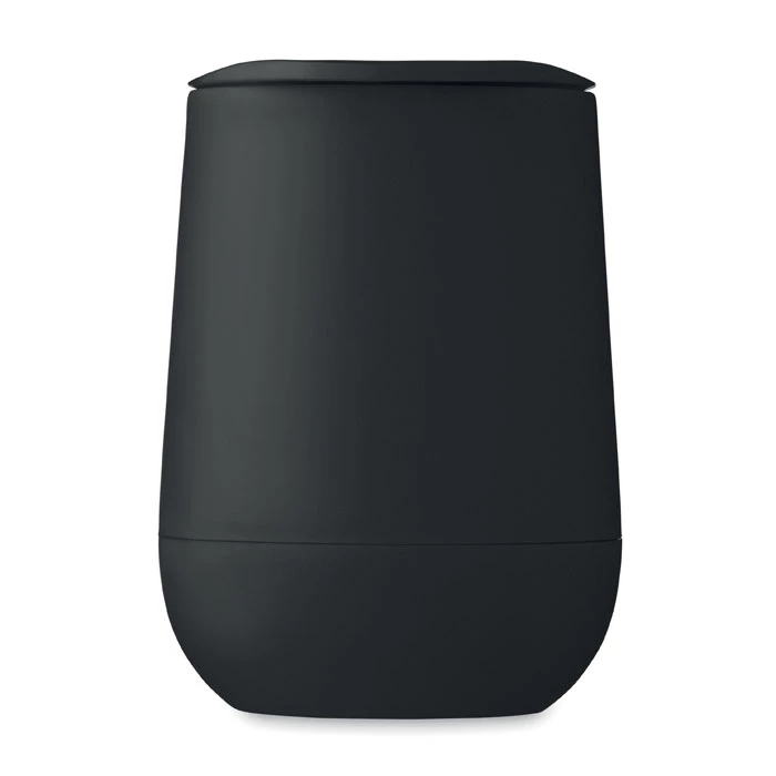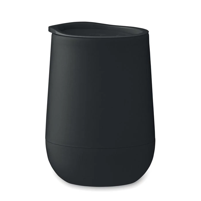 Kubek o podwójnych ściankach z PP z zamykaną pokrywką z ustnikiem z PS i ABS. Pojemność: 300 ml.