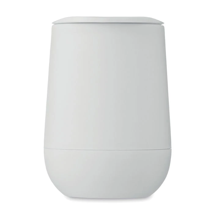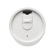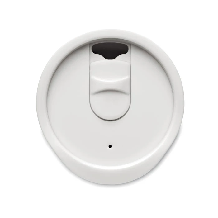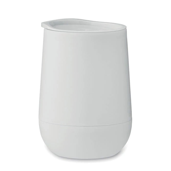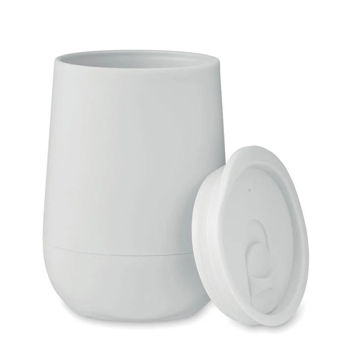 Kubek o podwójnych ściankach z PP z zamykaną pokrywką z ustnikiem z PS i ABS. Pojemność: 300 ml.
