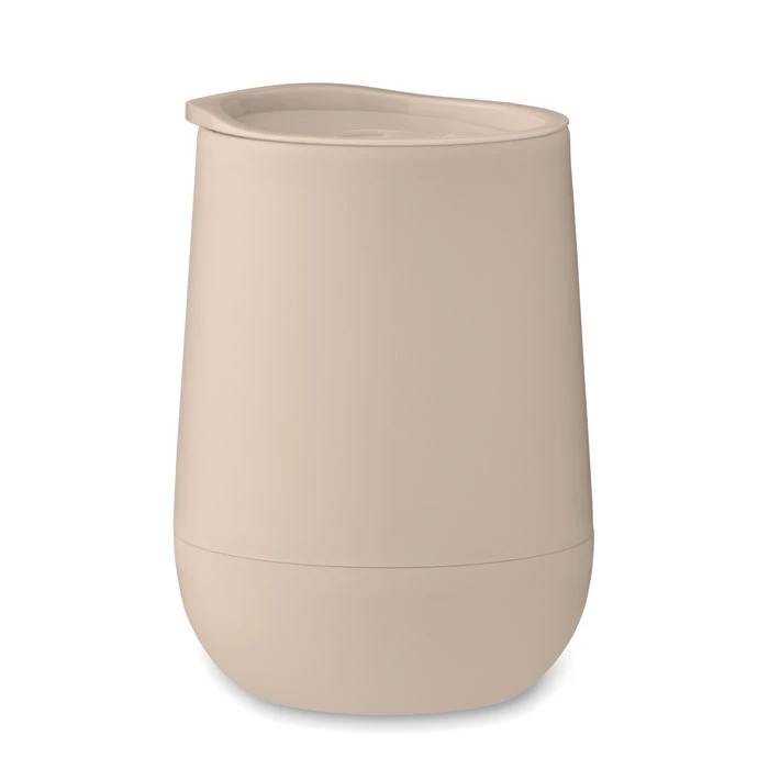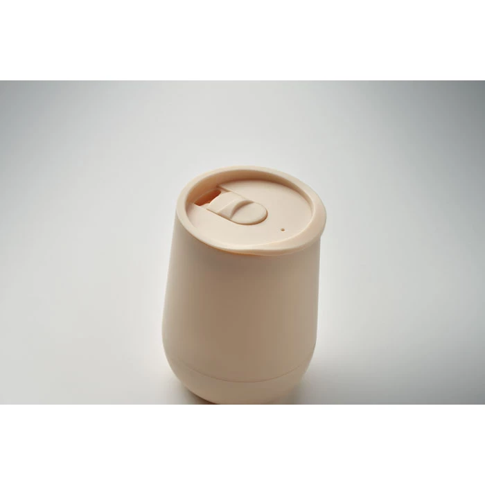 Kubek o podwójnych ściankach z PP z zamykaną pokrywką z ustnikiem z PS i ABS. Pojemność: 300 ml.