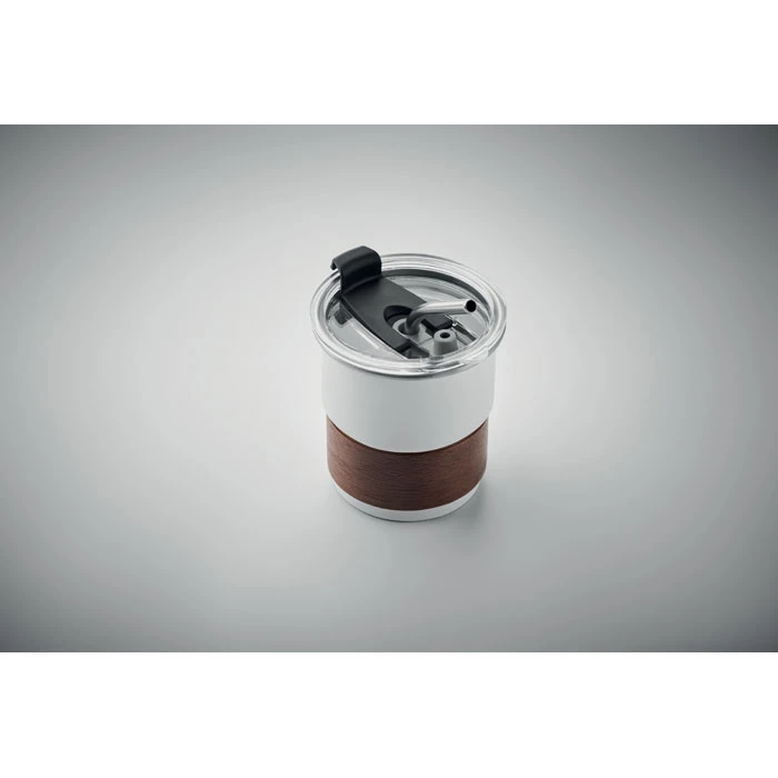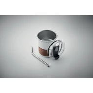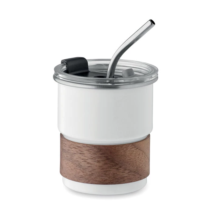 Jednościenny kubek z recyklingowanej stali nierdzewnej (90% stali nierdzewnej z recyklingu i 10% stali nierdzewnej) z odłączanym uchwytem z drewna akacjowego i słomką ze stali nierdzewnej. Szczelna pokrywka z otworem na słomkę i otworem do picia. Pojemność: 260 ml. Ponieważ jest to kubek z pojedynczą ścianką, może dochodzić do wymiany ciepła.