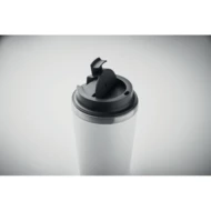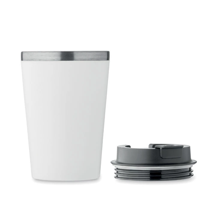Kubek z podwójną ścianką. Zewnętrzna z PP i wewnętrzna ze stali nierdzewnej z recyklingu (90% stali nierdzewnej z recyklingu i 10% stali nierdzewnej) z ceramiczną powłoką wewnętrzną. Nie przecieka. Pojemność: 350 ml.