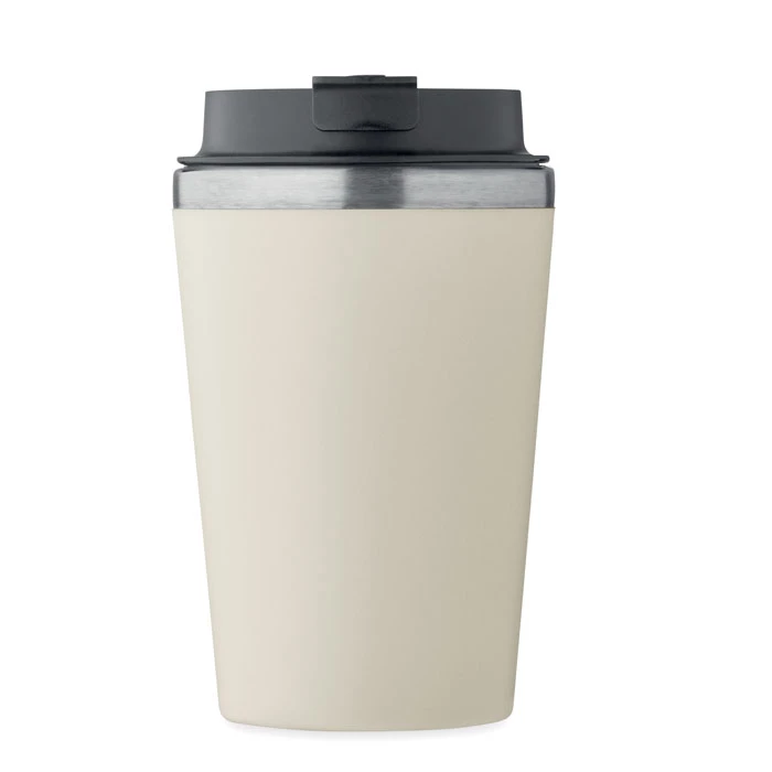 Kubek z podwójną ścianką. Zewnętrzna z PP i wewnętrzna ze stali nierdzewnej z recyklingu (90% stali nierdzewnej z recyklingu i 10% stali nierdzewnej) z ceramiczną powłoką wewnętrzną. Nie przecieka. Pojemność: 350 ml.