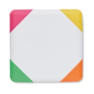Kwadratowy zakreślacz w obudowie z ABS. 4 kolory tuszu: żółty, różowy, pomarańczowy i zielony.