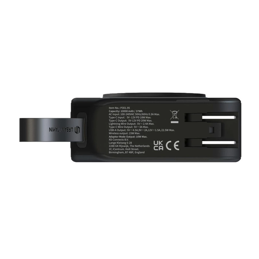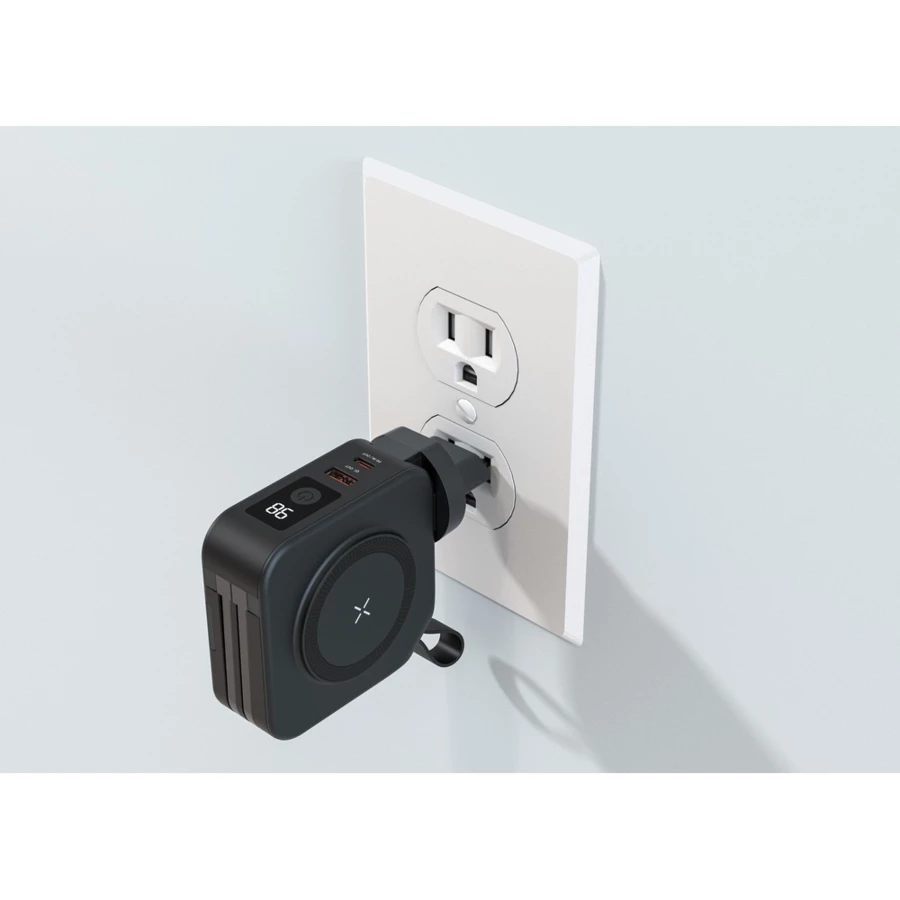 Ładowarka 5 w 1, power bank 10000 mAh, ładowarka ścienna, magnetyczna ładowarka bezprzewodowa 15W, adapter podróżny (Australia, UE, Wielka Brytania, USA, Azja), stojak na telefon, działa z telefonami posiadającymi możliwość ładowania indukcyjnego, wyjście USB, wyjście USB typu C, zintegrowane kable, ślad węglowy produktu: 2,51 kg CO2