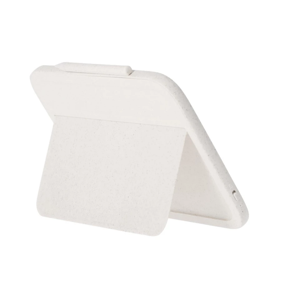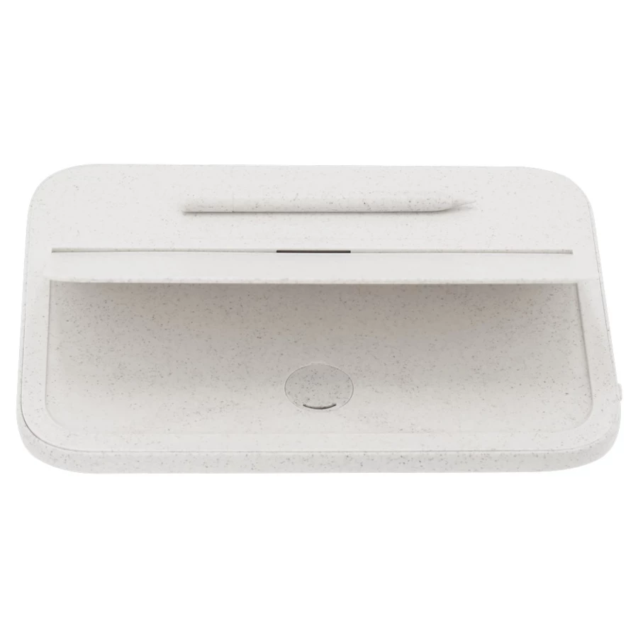 Ładowarka bezprzewodowa 15W, działa z urządzeniami posiadającymi możliwość ładowania indukcyjnego, zintegrowana tablica LCD z dołączonym rysikiem umożliwiającym zostawianie wiadomości lub rysowanie, posiada przycisk wymazywania i blokadę zapobiegającą wymazywaniu, wejście USB-C 5-9V/2A, kabel USB-C w komplecie, stojak na telefon, produkt wykonany z włókien słomy pszenicznej, ABS i bambusa