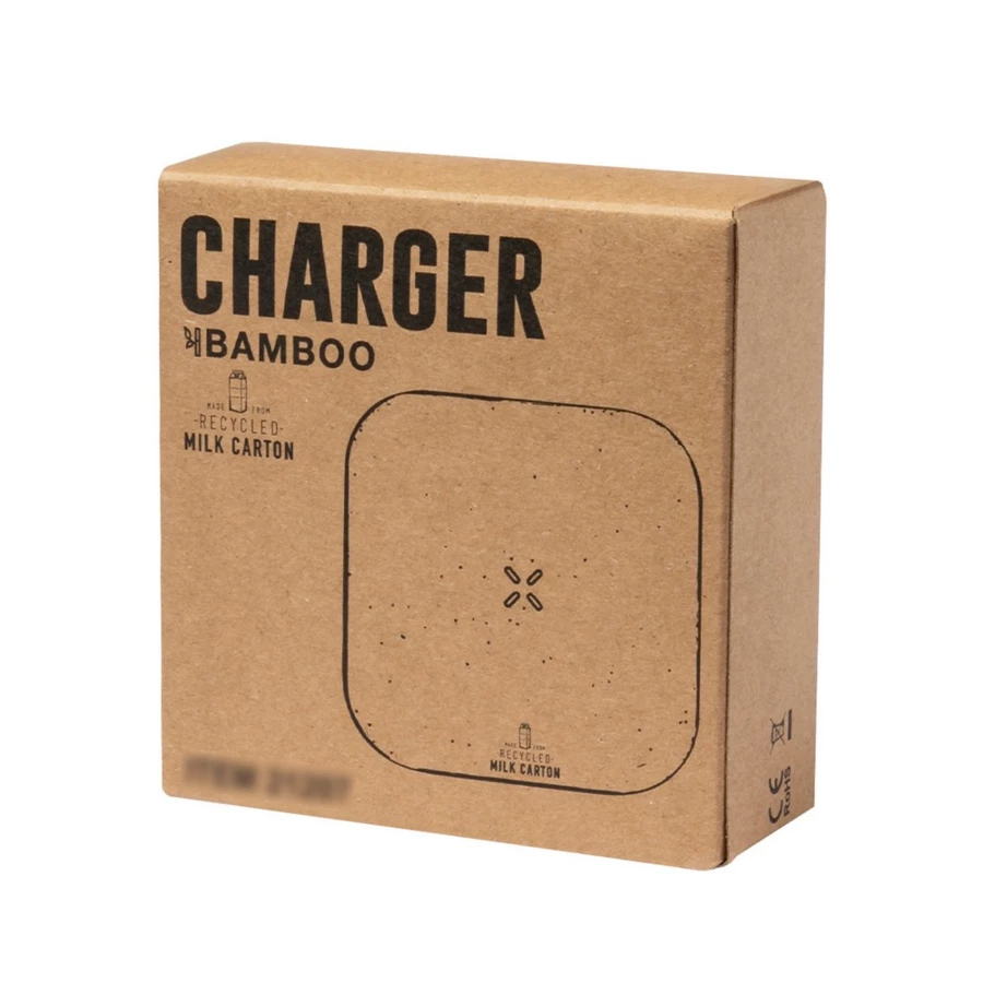Ładowarka bezprzewodowa 15W, wykonany ze zrecyklingowanych kartoników po mleku, bambusowe elementy, działa z urządzeniami posiadającymi możliwość ładowania indukcyjnego, wejście/wyjście USB-C 5-9V/2-2.2A, wyjście USB 5V/2A, antypoślizgowy spód, kabel USB-C w komplecie