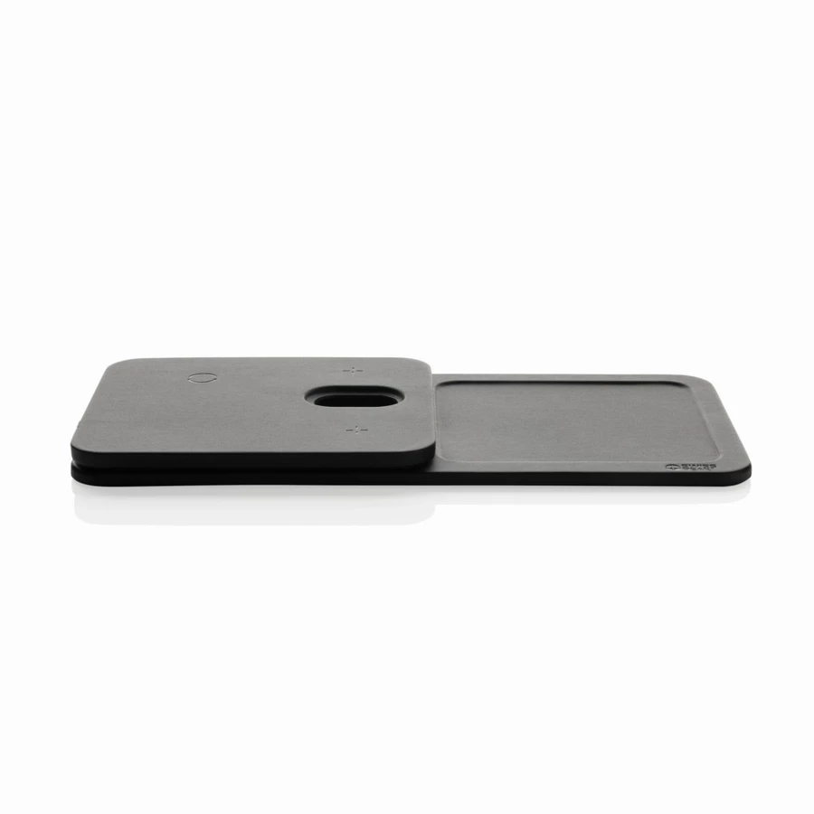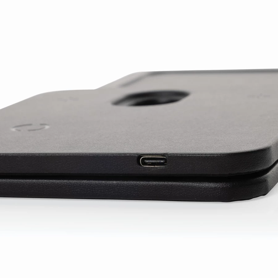 Ładowarka bezprzewodowa 3 w 1 Swiss Peak, wykonana z recyklingowanego PU RCS, elegancka i składana, magnetyczna ładowarka 15W, dodatkowa ładowarka 5W do etui na słuchawki lub innych urządzeń oraz ładowarka 2,5W do smartwatchy (Apple Watch), kabel TPE 120 cm, opakowanie FSC® mix, bez PVC, wejście 9V/3A, wyjście: telefon 15W, słuchawki 5W, zegarek 2,5W