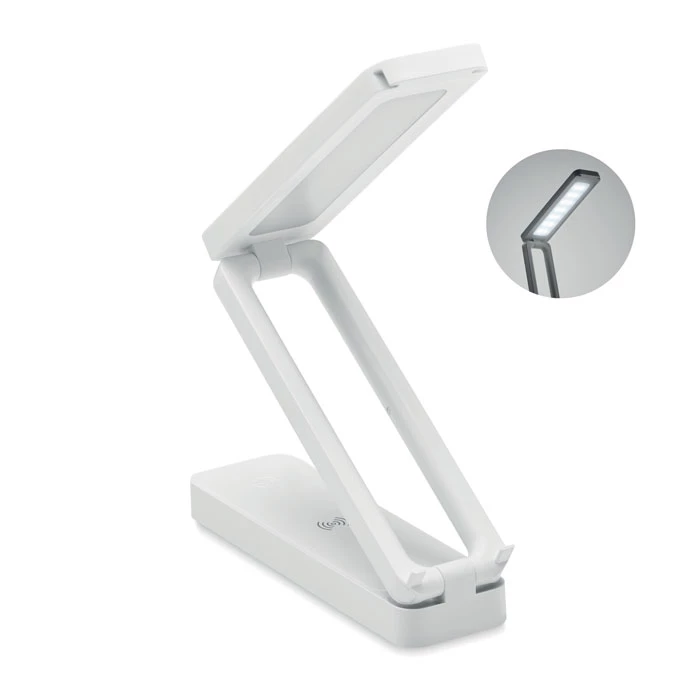 Składana lampa biurkowa wykonana z ABS z 14 diodami LED, z 3 poziomami jasności, z bezprzewodową ładowarką 10W. Wyjście: DC 9V/1.1A (10W) do szybkiego ładowania.