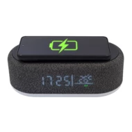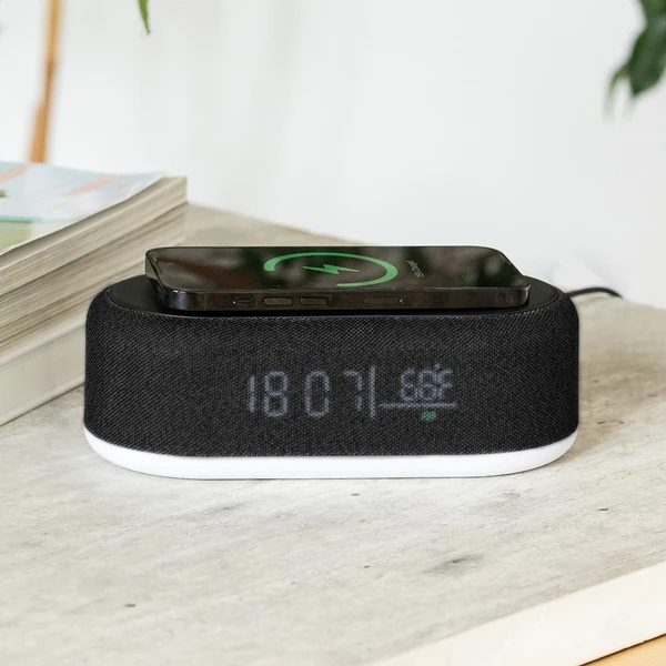 Ładowarka indukcyjna z wyświetlaczem, zasilana przez kabel USB (w zestawie). Funkcje urządzenia: zegar, data, temperatura, budzik, ładowanie indukcyjne (15W), 3 poziomy regulacji jasności lampki LED.