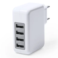Ładowarka z 4 portami USB, całkowita moc urządzenia: 5V/3.1 A, wejście AC 100-240V, 50/60Hz 0.5A, wyjście 1: 5V/2.1A, wyjście 2: 5V/2.1A, wyjście 3: 5V/1A, wyjście 4: 5V/1A, maksymalna moc wyjściowa przy korzystaniu z jednego portu USB: 2.1A, możliwość ładowania czterech urządzeń jednocześnie