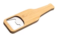 Otwieracz w kształcie butelki, wykonany ze stali nierdzewnej i elementami z bambusa.
