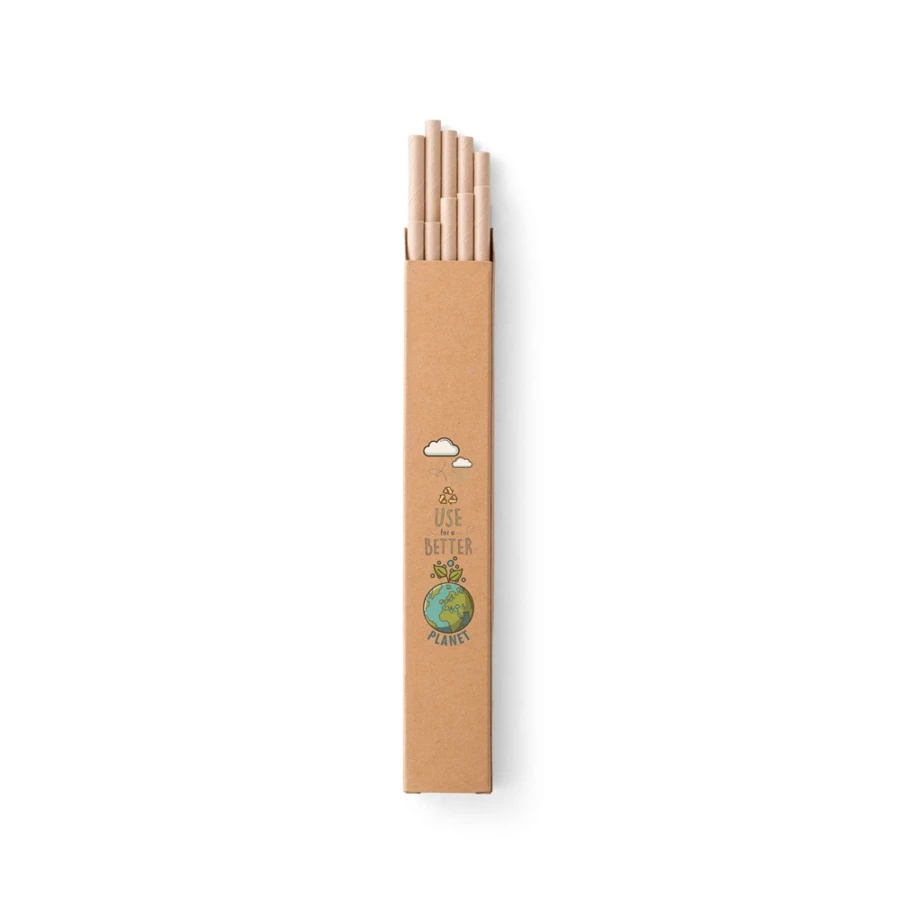 Zestaw 10 jednorazowych słomek wykonanych z papieru kraftowego. Dostarczany w pudełku z papieru kraftowego. Słomka: ø6 x 196 mm | pudełko: 33 x 200 x 14 mm