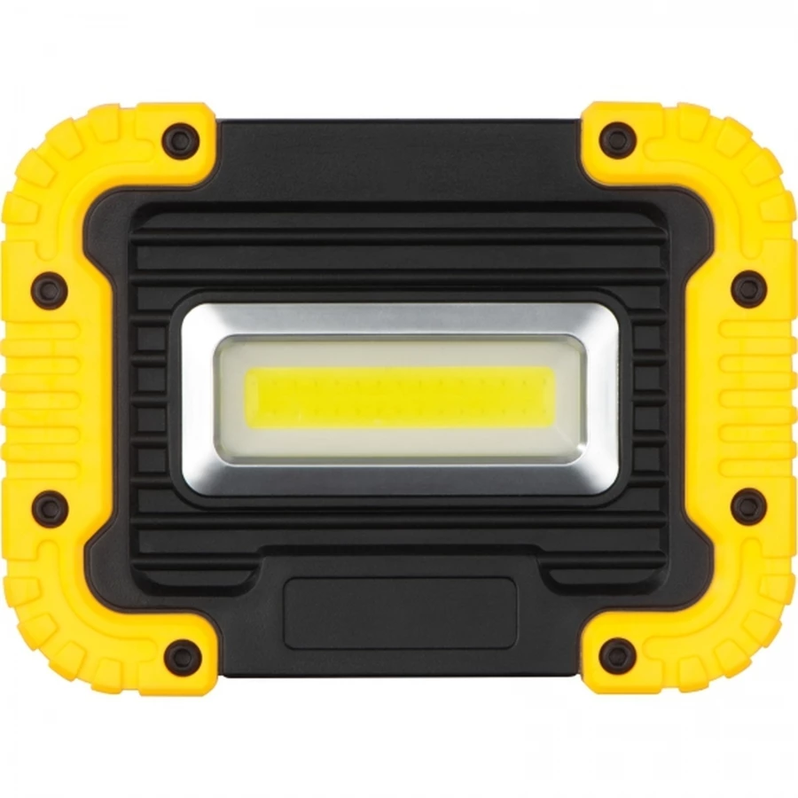Plastikowa lampa robocza o mocy 10 W. Wyposażona w 3 tryby świecenia (zwykły, SOS i migający) i składany uchwyt, który może służyć jako podstawka do utrzymania lampy w konkretnej pozycji lub jako rączka do przenoszenia.