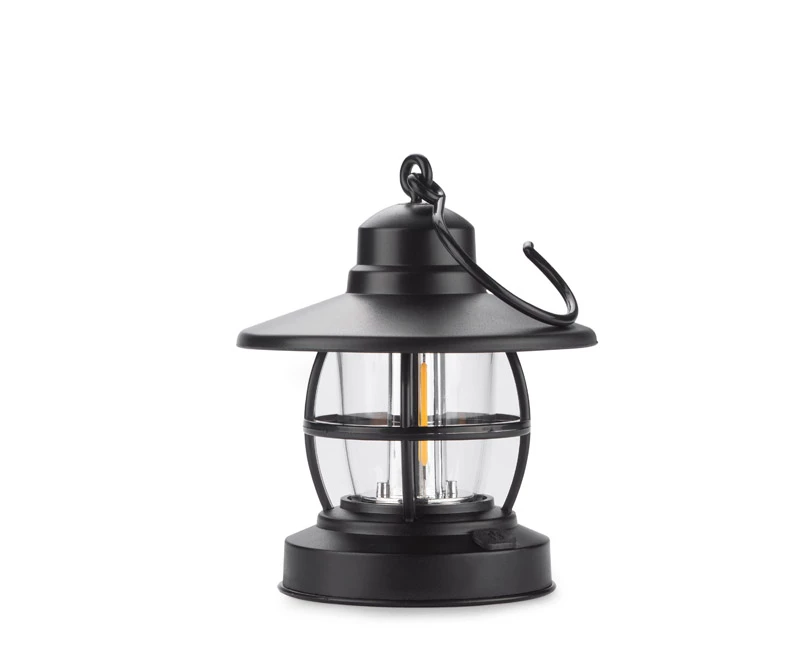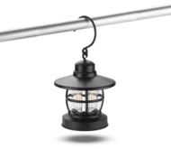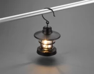 Przenośna lampka CAMPE z diodami typu COB. Duży haczyk pozwala na wygodne powieszenie. Zasilanie bateriami: 3 x AAA.