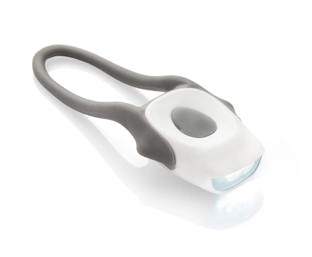 Praktyczna lampka rowerowa z dwoma diodami LED oraz silikonowym mocowaniem do roweru. Lampka przednia - posiada białe diody.