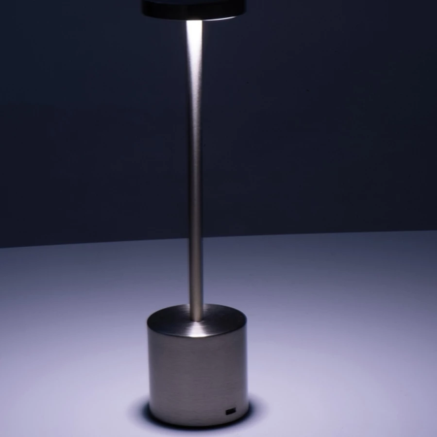 Litowa lampka stołowa wykonana ze stali nierdzewnej. Lampa posiada 24 lampki LED i baterię o pojemności 800 mAh ładowaną na kabel typu-C (dołączony do produktu). Lampa ma fukcję przyciemniania i wyboru barwy światła między ciepłym, a chłodnym.