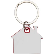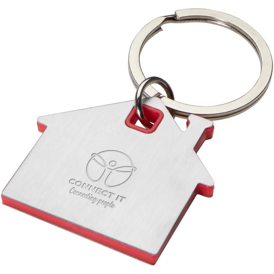 Łańcuszek do kluczy z brelokiem w kształcie domu, z płytką ze stali nierdzewnej o szczotkowanej strukturze z przodu i z tyłu oraz z kolorowym plastikowym elementem pośrodku.