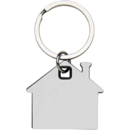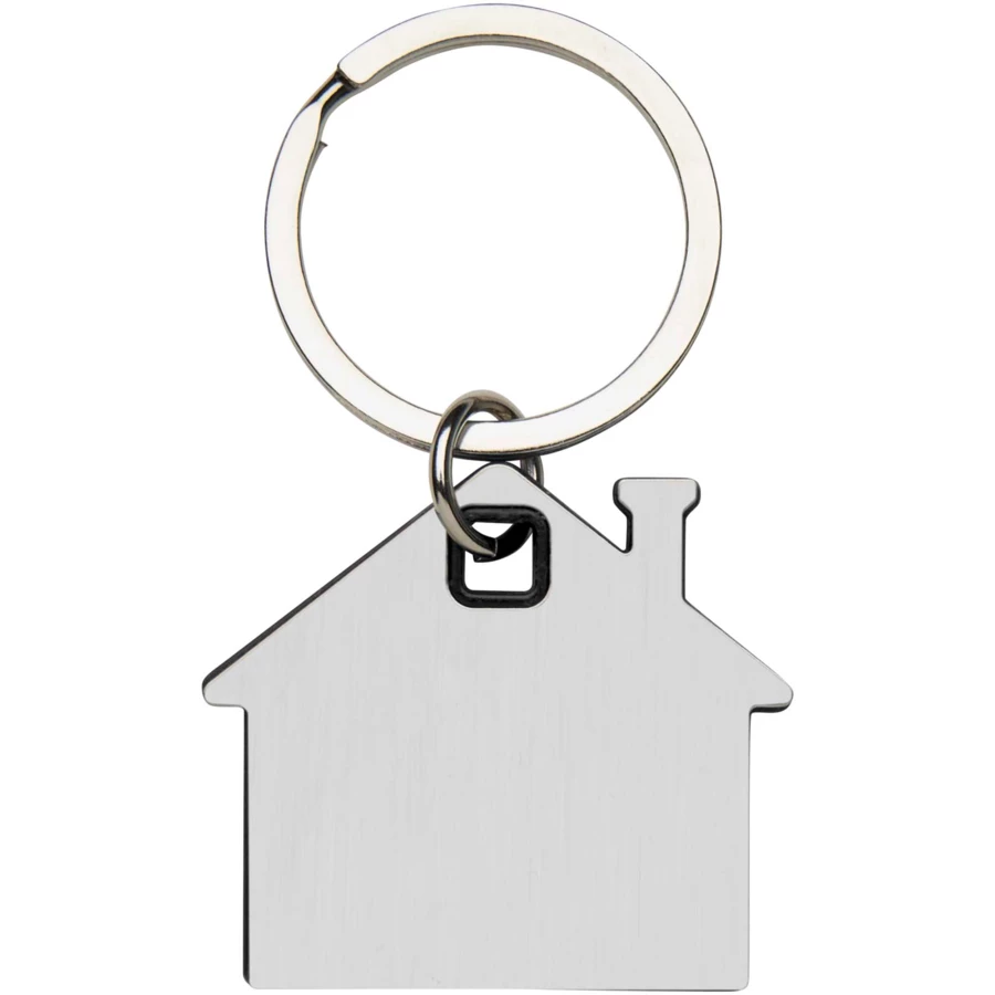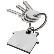 Łańcuszek do kluczy z brelokiem w kształcie domu, z płytką ze stali nierdzewnej o szczotkowanej strukturze z przodu i z tyłu oraz z kolorowym plastikowym elementem pośrodku.